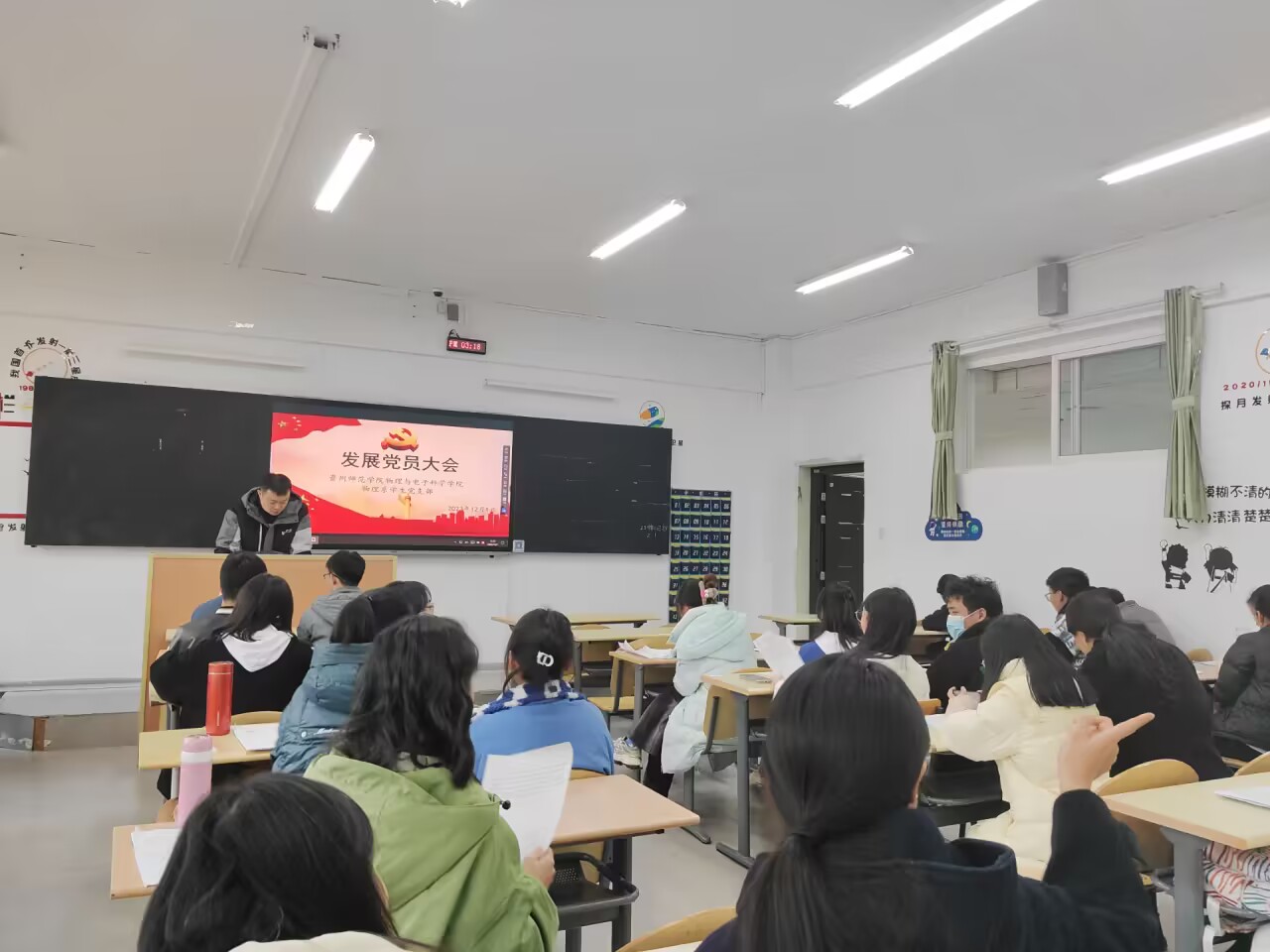 12月1日,物理系员工党支部发展党员大会在宁静楼428教室举行。物理系员工党支部全体党员、党员发展对象参加了此次会议,大会由党支部书记付诗君主持。 首先,培养联系人介绍王艺等6名同志有关情况;随后,王艺等6名同志分别汇报有关情况;接着,支委会向支部大会说明王艺等6名同志的政审情况。经无记名投票表决,最后由员工党支部书记带领预备党员进行入党宣誓六项内容。会上,付诗君强调,无论是新加入的党员还是老党员都要不断加强理论学习,扎实理论基,不管何时何地都要以党员的要求严格自己,积极发挥先锋模范作用。 本次组织发展大会的召开,为我系党总支注入了新鲜的血液,壮大了公司的党员队伍。